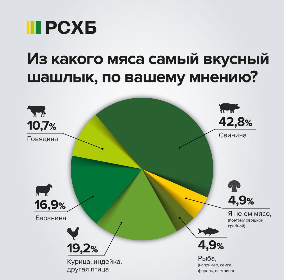 К открытию «шашлычного» сезона Россельхозбанк провёл опрос и выяснил, что: любимое мясо россиян – свинина с 43% голосов, самостоятельно его готовят 69%, главная «добавка» – хорошая компания – 29%, а 40% верят в свою возможность съесть от 500 грамм и более, верхнего предела нет.