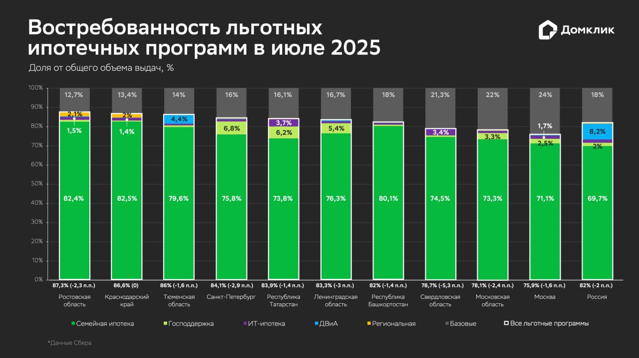 Среди регионов-лидеров по объёму выдач (представлены на инфографике) высокая доля выдач по Семейной ипотеке отмечается в Краснодарском крае (82,5%) и Ростовской области (82,4%).