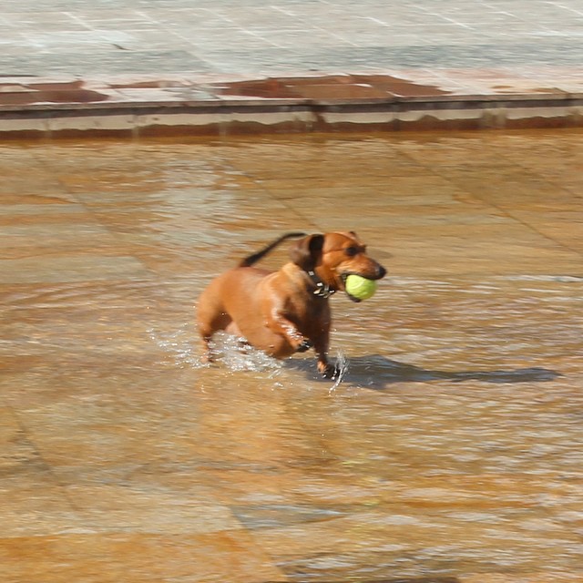 А этой собачке холода не страшны. Такса задорно бегает по фонтану и просто радуется жизни.