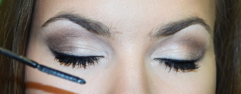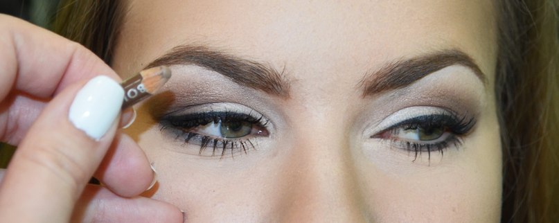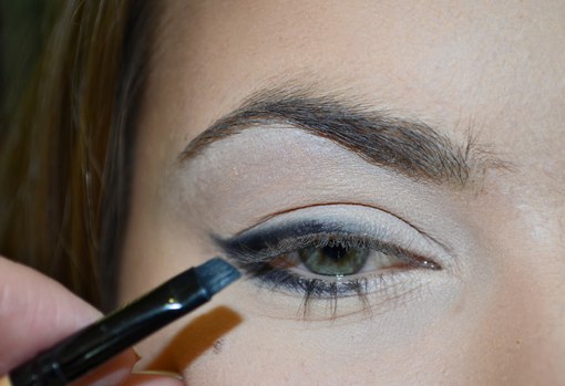 Подведите веки с внешней стороны темным карандашом до середины глаза. Растушуйте карандаш твердой кистью или спонжем с другой стороны карандаша.