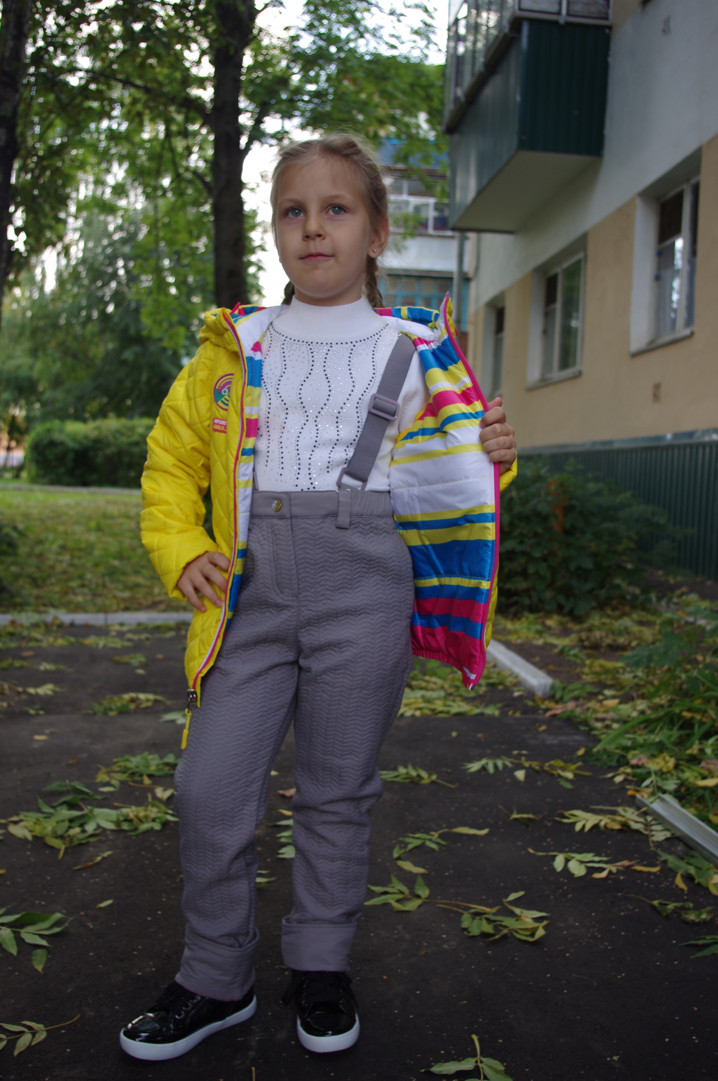 - Многие мамочки задаются вопросом о том, как красиво, а главное комфортно и удобно одеть своего ребёнка в осеннюю пору. В образе маленькой модели как раз представлен очень удачный комплект одежды. На юной леди прекрасно сочетаются удобство, комфорт и красота. Умеренный костюм из серых брюк и белого свитера, прекрасно подходит как для прогулок, так и для похода в школу, красочно подчёркивается чёрными лакированными кедами на небольшой платформе и ярко жёлтой курткой. Такой наряд позволит сохранить хорошее настроение в серую осеннюю погоду.