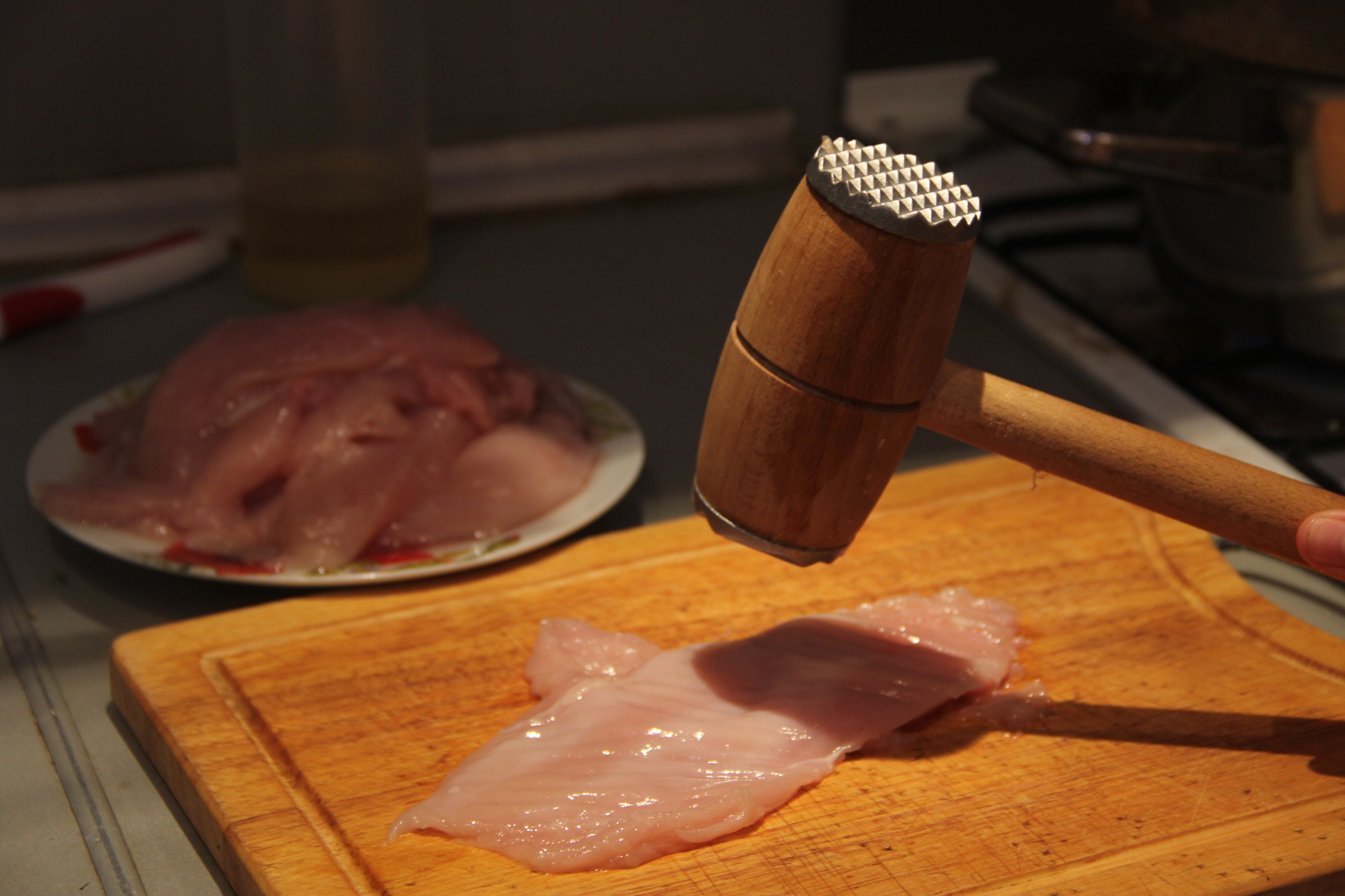 Нарезаем мясо порционными кусками поперек волокон, отбиваем молотком с одной стороны.