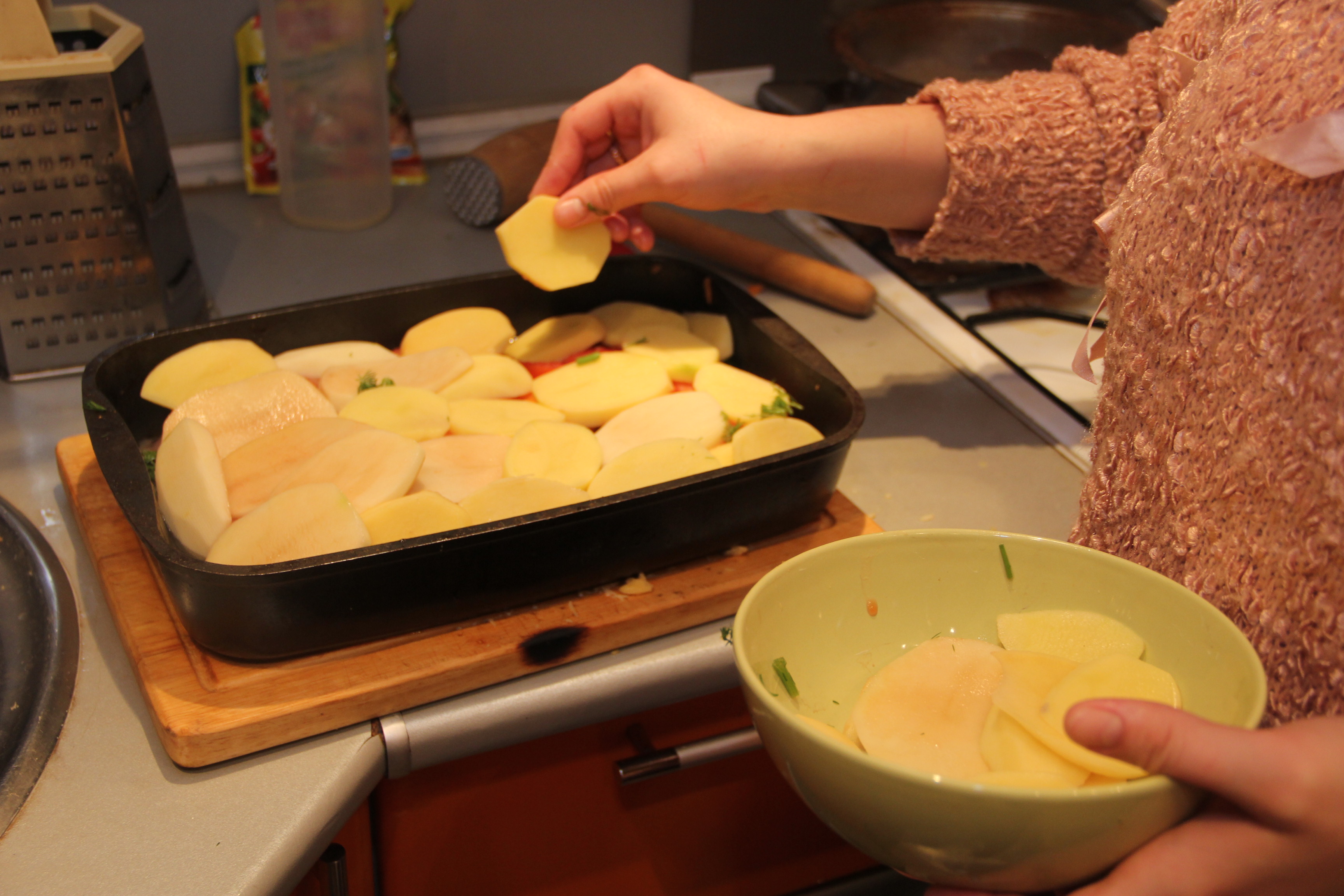 Так же, кольцами, режем картофель и выкладываем на помидор.