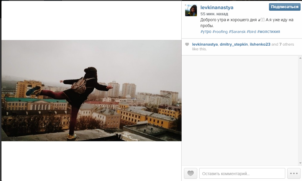 А levkinanastya уже успела забраться на одну из крыш. И зачем?! Чтобы понаблюдать за прекрасным видом Саранска и сделать "ласточку". Неординарное начало дня!