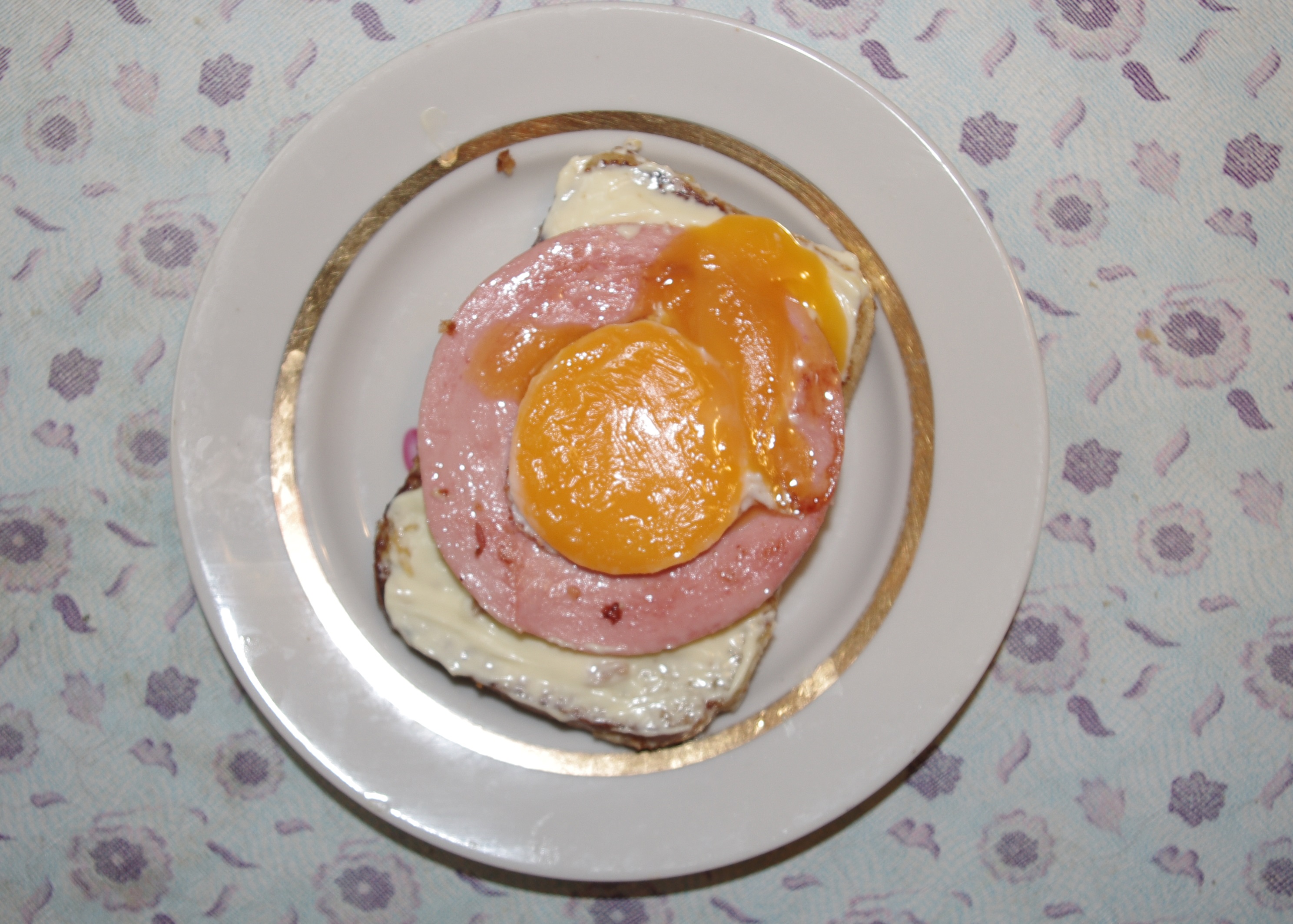 6. Обжариваем желток и выкладываем поверх колбасы.