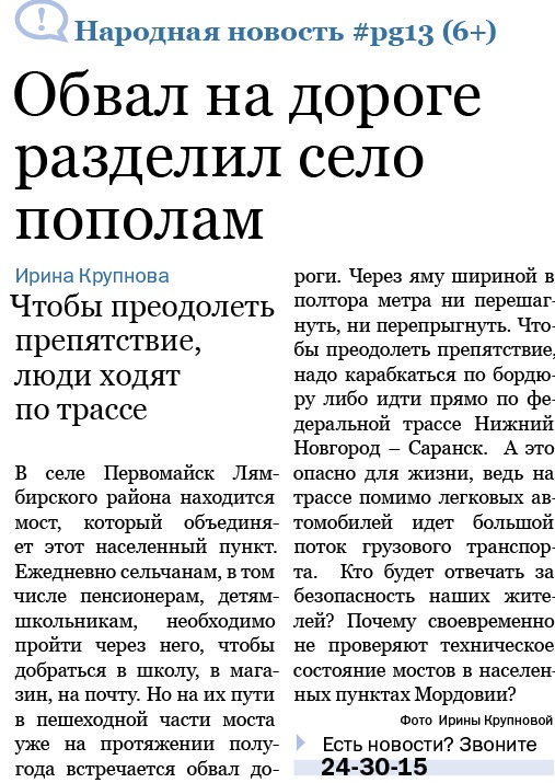 Ирина Крупнова за новость и фото о разрушенной дороге (стр. 3) – 300 рублей.