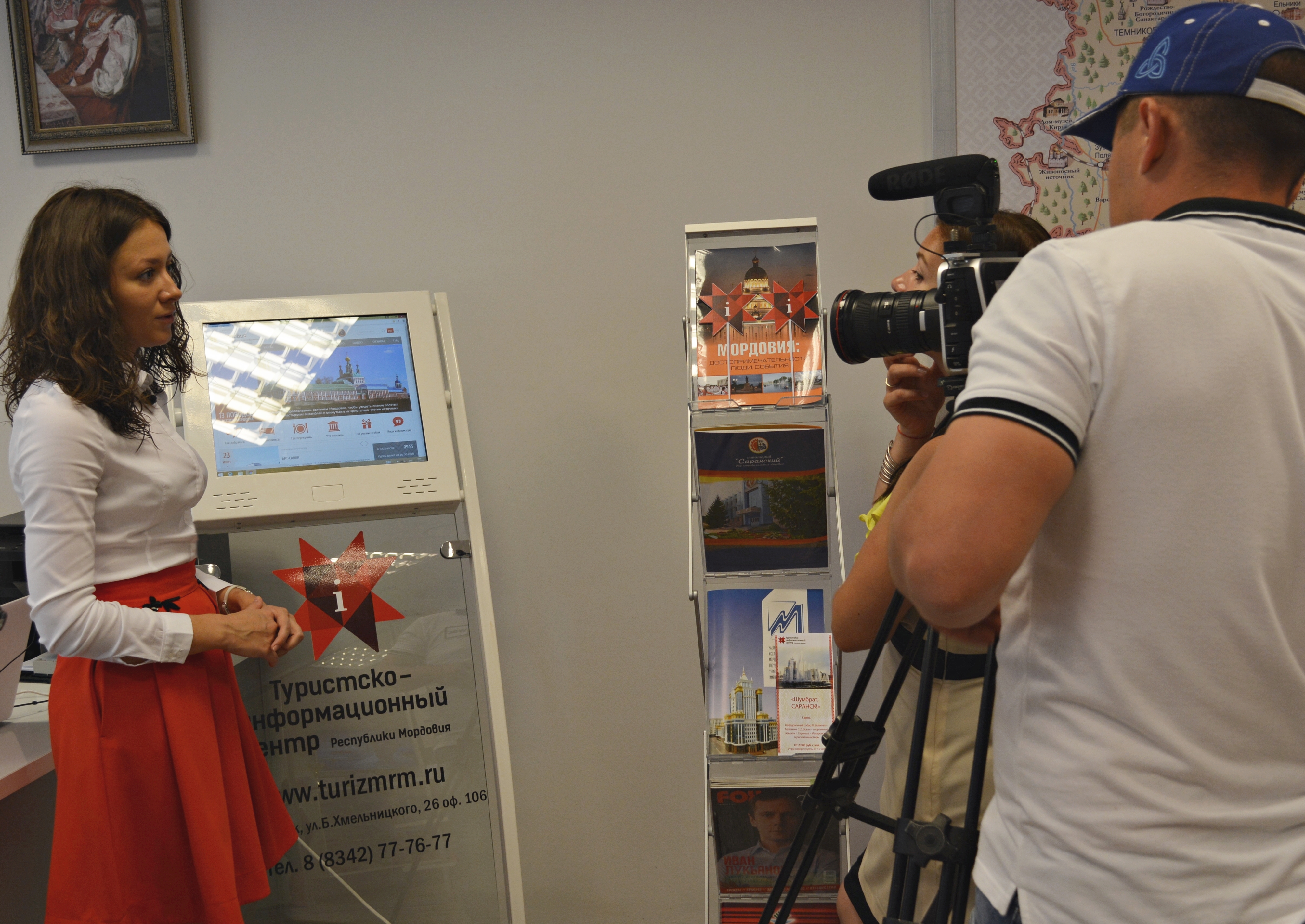 Для более полного знакомства с туристским потенциалом Саранска и республики в целом, съемочная группа отправилась в Туристско-информационный центр. Директор ТИЦ РМ Юлия Александрова рассказала о том, как же готовится Саранск к встрече болельщиков ЧМ-2018. В особенности, было уделено внимание, разработанным комплексным туристским маршрутам на 1, 2 и 3 дня пребывания гостей в столице Мордовии и турам, которые уже сейчас пользуются популярностью у туристов – «Этническая Мордовия» и «Заповедный край». Тележурналистов заинтересовал туристско-информационный портал, который стал удобным и полезным путеводителем по Мордовии не только для гостей, но и самих жителей республики.