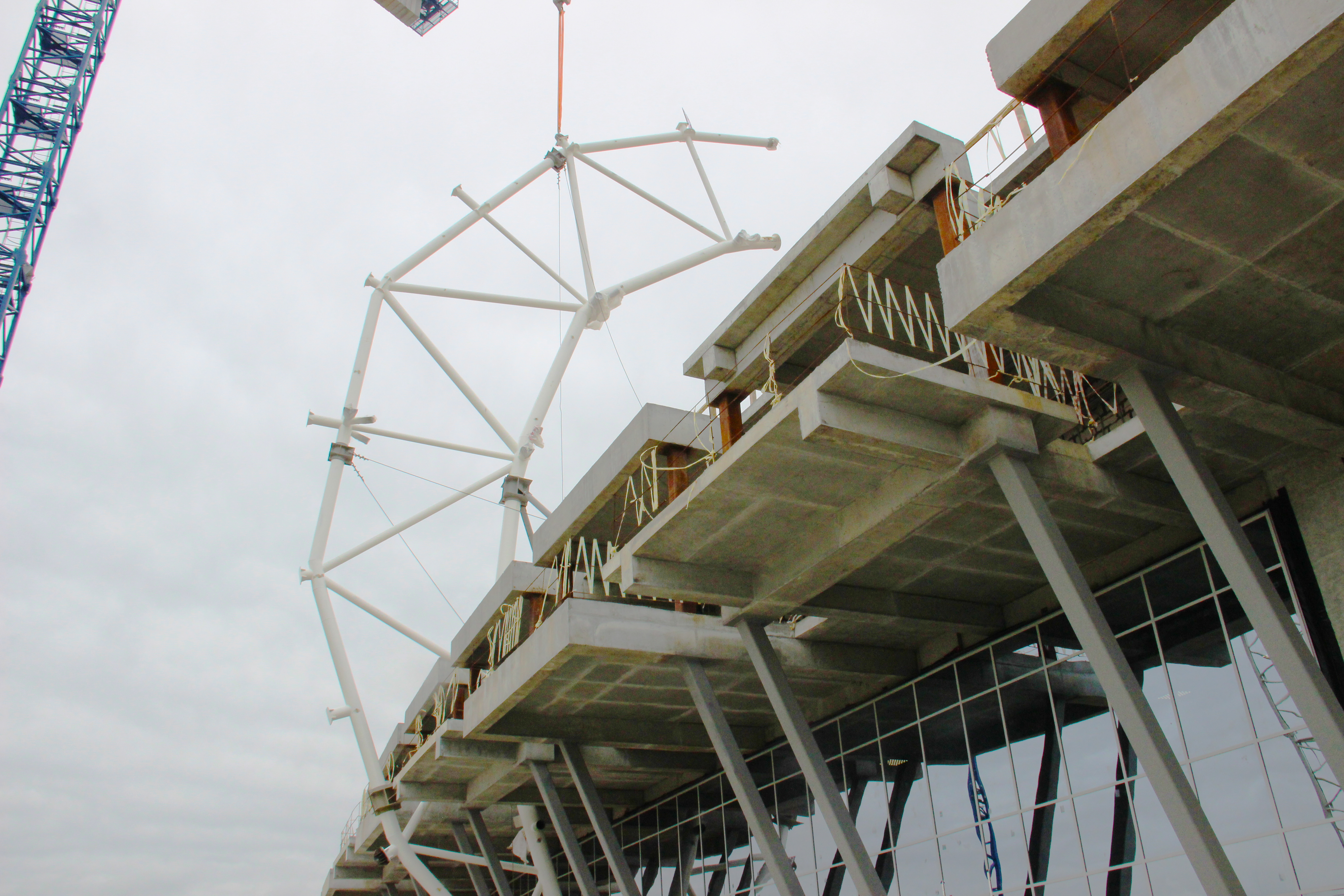 «Технически это одна из самых сложных и в то же время самых интересных и захватывающих стадий строительства. Монолит практически закончен и начинается новый этап. Двумя кранами консоль поднимается из горизонтального в вертикальное положение. После чего кран грузоподъемностью 350 тонн будет поднимать эту консоль наверх для монтажа. Работы по монтажу металлоконструкций, согласно графику, должны завершиться в мае 2017 года. Общий вес металлоконструкций кровли стадиона будет составлять 6300 тонн», - отметил главный инженер ООО «СК «Татдорстрой» Дмитрий Догадов.