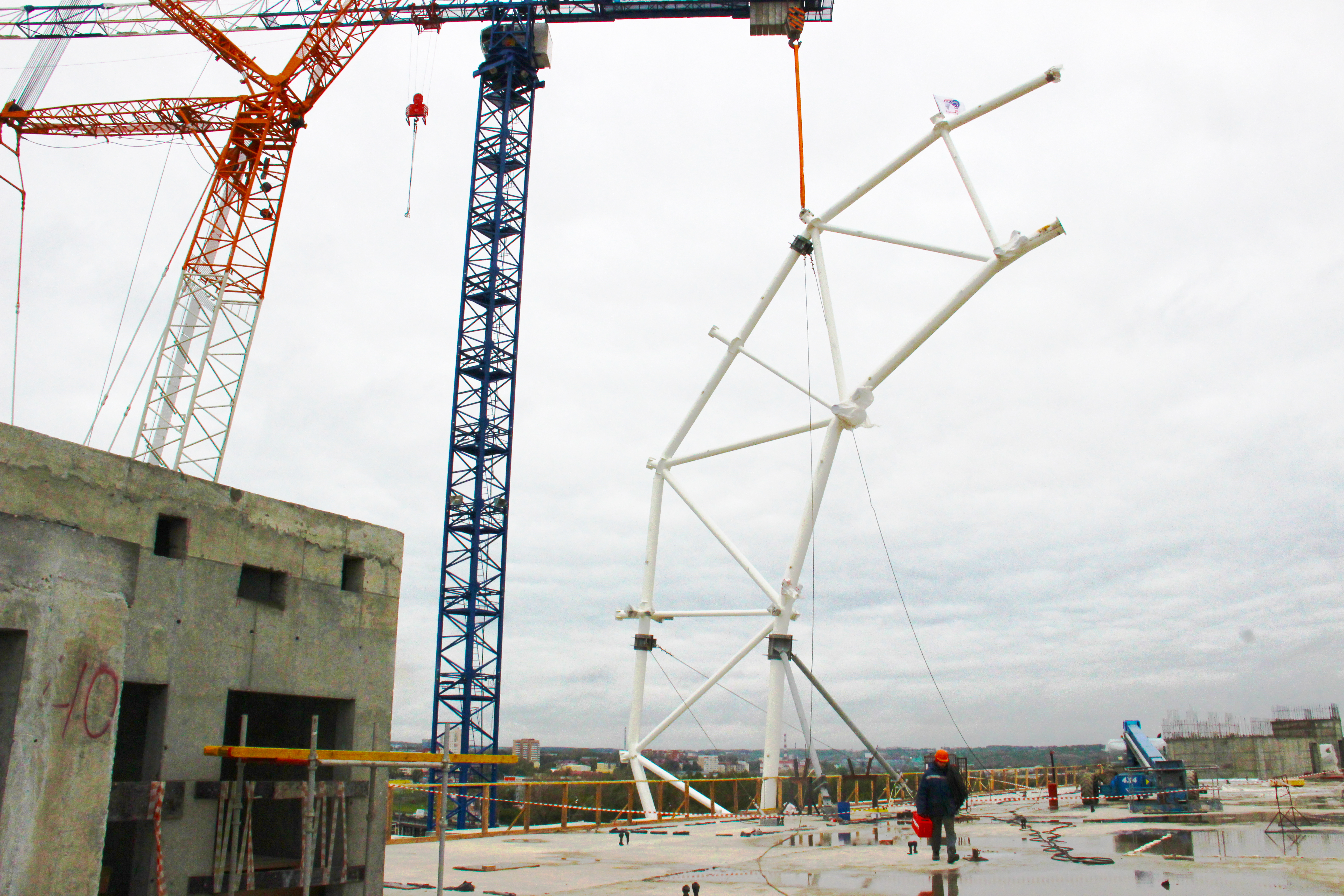 Строители стадиона «Мордовия Арена» приступили к новому этапу работ – подъему внешних консолей монтажного блока конструкции кровли стадиона. Уже была поднята и закреплена первая половина консоли весом 25 тонн. Всего планируется установить 88 консолей по всей окружности стадиона.