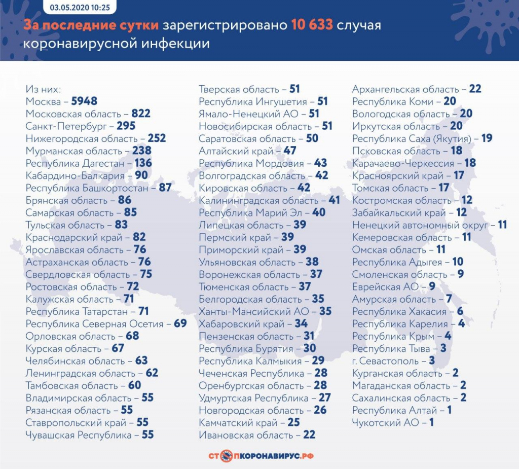 За последние сутки в России подтверждено 10633 случая новой коронавирусной инфекции в 85 регионах. Выписано по выздоровлению 1626 человек. Зафиксировано 58 летальных случаев.