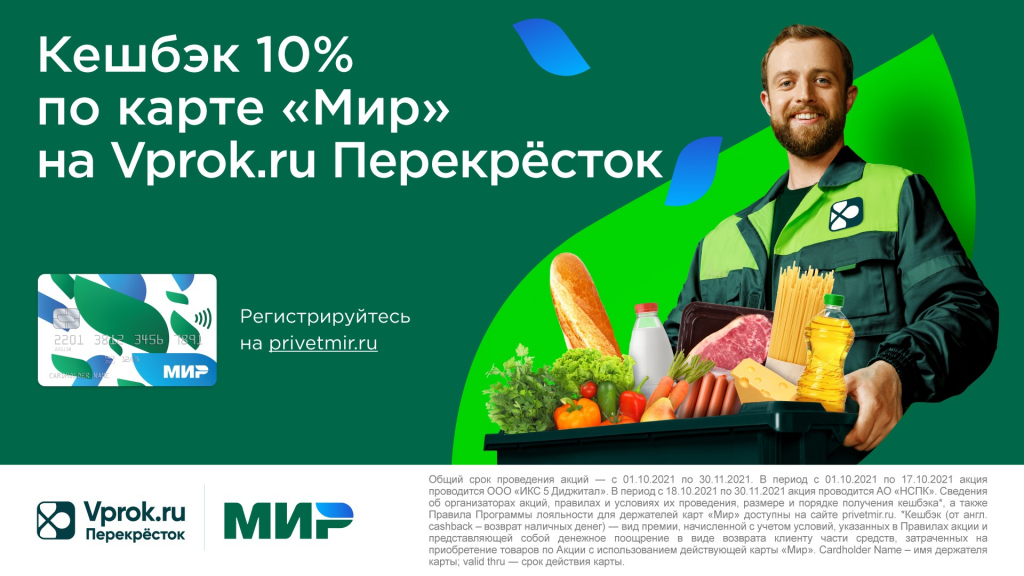 С 1 октября по 30 ноября 2021 года держатели карт «Мир» будут получать кешбэк 10% за каждый заказ на сайте Vprok.ru. Кешбэк вернется рублями в течение 3-5 дней на карту, с которой была оплачена покупка. Максимальная сумма, которую участники акции смогут получить за весь период акции – 2000 рублей.