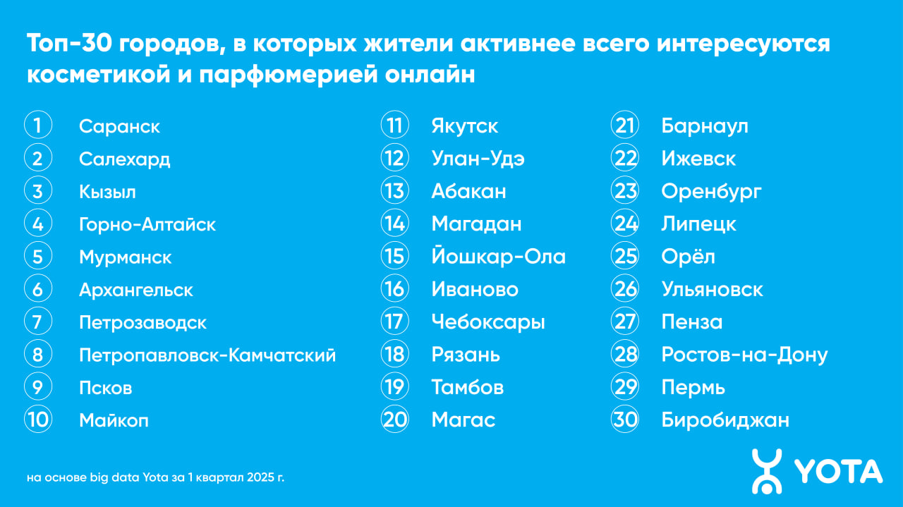 За год интерес россиян к онлайн-шоппингу в косметическом сегменте вырос: средний трафик на сайтах этих магазинов вырос на 6%. Жители Саранска, Салехарда и Кызыла чаще остальных интересуются онлайн-покупками косметики и парфюмерии — на жителей этих городов приходится больше всего интернет-трафика в расчете на одного пользователя. К такому выводу пришли аналитики Yota на основе обезличенных данных абонентов.