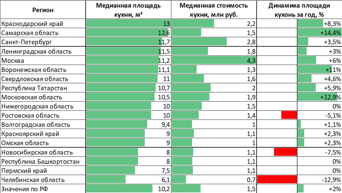 При этом можно заметить, что площадь кухонь растёт в субъектах, где она уже превышает средние показатели по стране. Обратный процесс наблюдается в регионах с маленькими кухнями: наиболее сильное падение зафиксировано в Челябинской области (-12,9%).