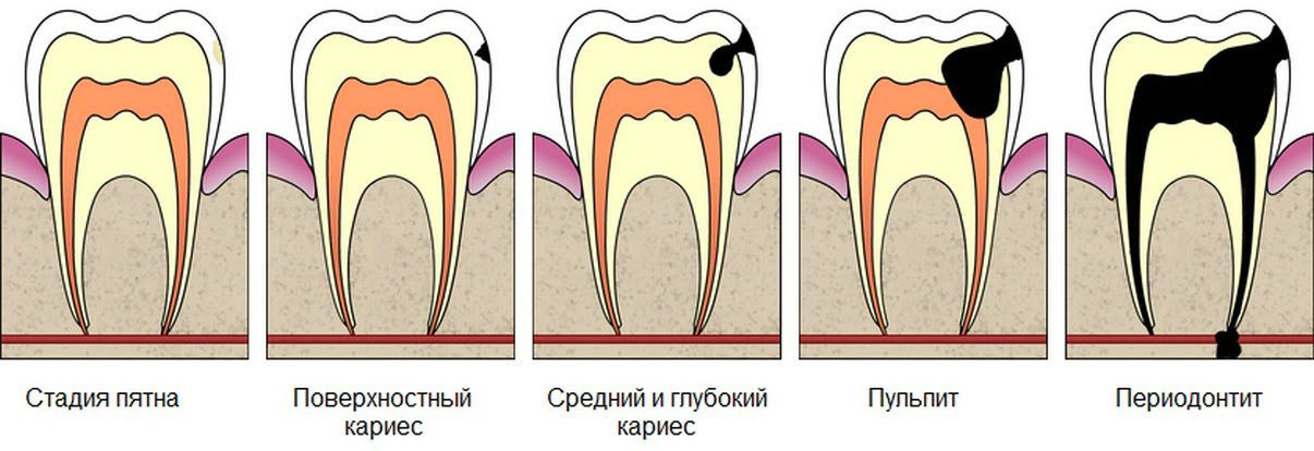 Кариес можно классифицировать по нескольким признакам: по месту локализации и по степени поражения тканей зуба.